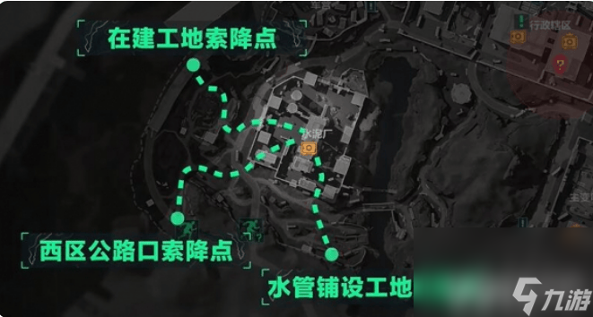 - 西侧水泥厂外围的三个索降点的玩家都直接冲水泥厂就行,距离近、资源多。