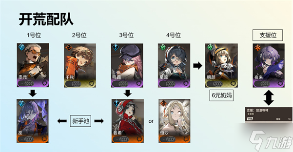 根据新手池情况调整角色,巫师替换忠元,音希或恒沙替换鸣霜,朝颜(奶妈)替换星凉。