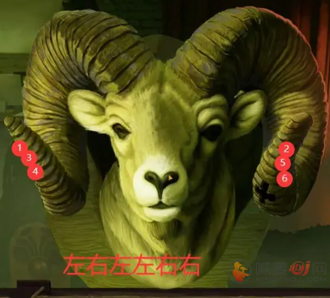 墙壁上的报章揭示了线索,根据书架上方提示,按照“左右左左右右”的顺序点击中间的羊头,可获得“羊角”。使用此“羊角”砸开前台左边的服装店橱窗,即可获取到“玻璃碎片”,并以此划破假人肚子找到“蓝色ID卡”。将该ID卡插入电脑右侧位置,成功解锁服装店内门。