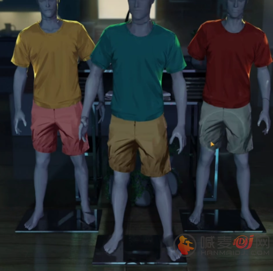 地上有△形状的杂志,根据三个杂志中的模特调整服装。下面是获得的白色围巾,它被缠绕在右边的一家二手店的红色灯柱上。接着使用玻璃碎片对床上的假人进行处理:腹痛司、胸痛司、头痛司。假人的胸前发现了一张红色ID卡,房间内找到羊角锤。