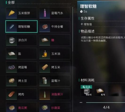 在制作过程中点击完成可以做出理智软糖,其最大数量限制为。为了充分利用这个资源,我们建议尽量达到上限。尽管它的用途广泛且消耗迅速,但制作的复杂性较低,所需材料不昂贵,所以一次性做完是最好的选择。