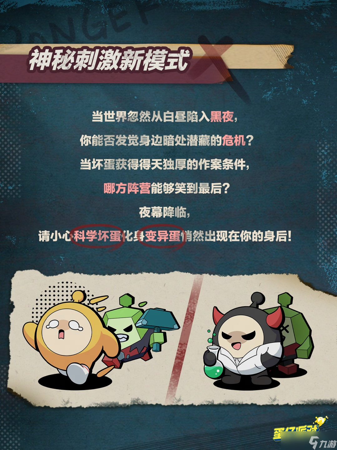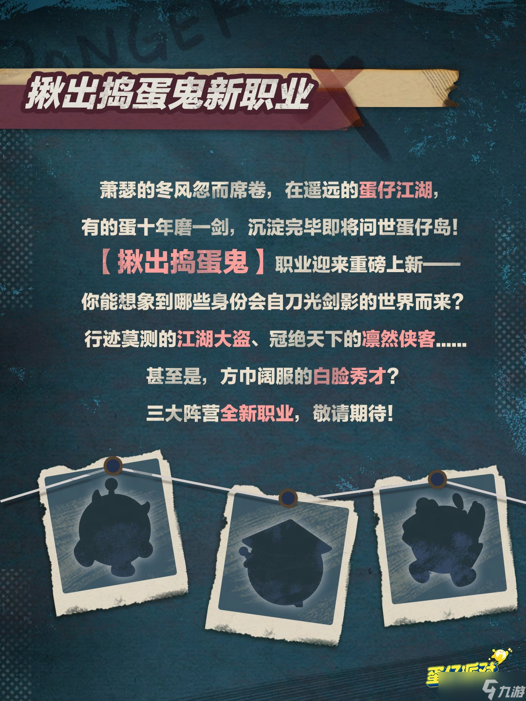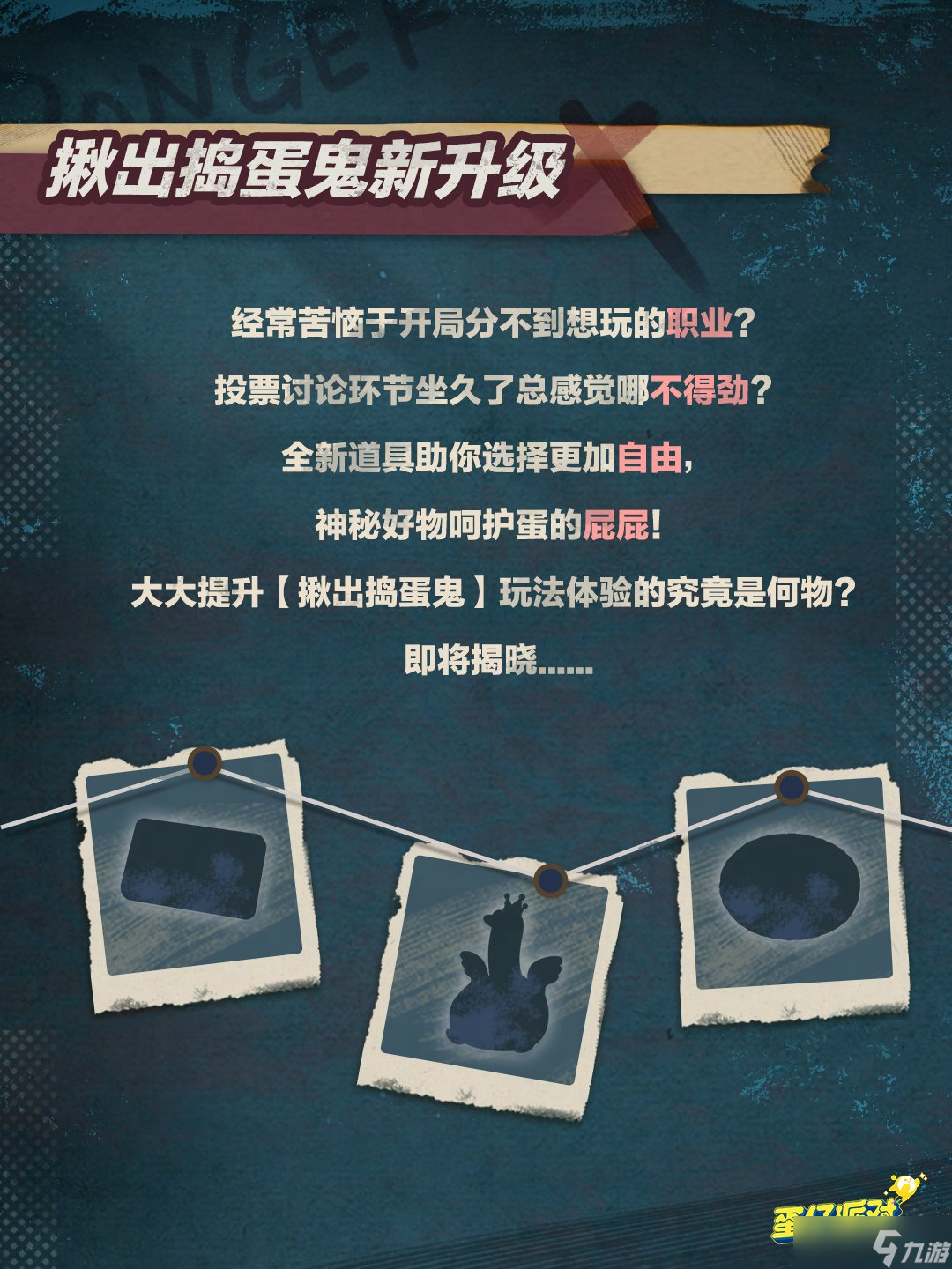 冬风凛冽,萧瑟之气弥漫。随着季节更迭,“揪出捣蛋鬼”模式将进行一次重大调整“变天”。揪出捣蛋鬼这一职业正迎来全新版本的到来,它将带来全新的身份和玩法体验。江湖上,有形迹莫测的侠盗、凛然正气的剑客......但你是否想过,会有方巾阔服的白脸秀才加入到这个充满刀光剑影的世界中?这一次,他们也将加入到揪出捣蛋鬼的职业队伍中来。新玩法即将重磅上线!当夜幕降临,空气中弥漫着一丝丝阴冷的气息,请小心科学坏蛋变身变异蛋,悄然出现在你我身后的黑暗角落。为了让你在这一过程中更加安全与舒适,我们精心研制了一种道具“蛋屁屁”。这种道具不仅能够细心呵护你的蛋,还能够为游戏体验保驾护航。新职业、新模式、新道具......这一切升级只为让你的“揪出捣蛋鬼”玩法体验更加丰富和有趣。敬请期待这一全新版本的到来!