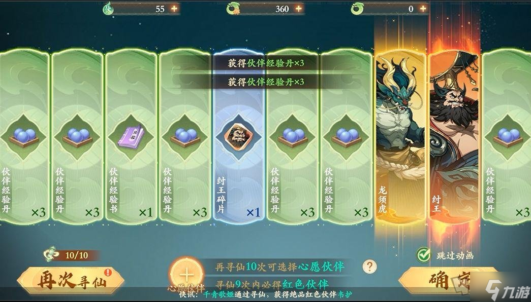 通过寻仙界面消耗寻仙卷轴获取伙伴,寻仙10次必得红色伙伴,50次可得特定心愿伙伴。