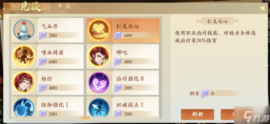 实操:首先进入场景后,先看右侧的【兑换】,看下初始的强化商城是否有【仁义之心】