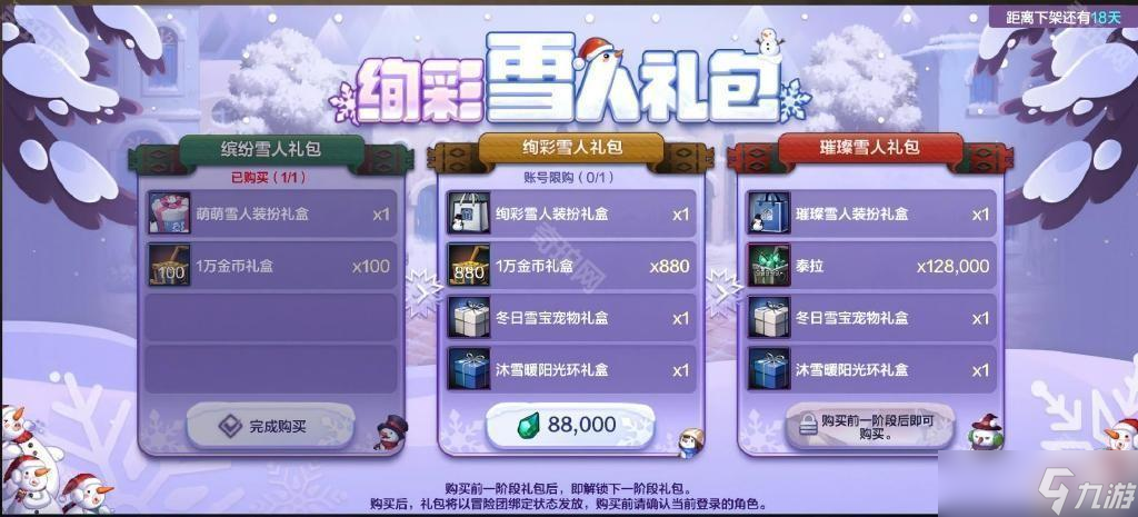 该礼包售价88000泰拉,领取上一个缤纷雪人礼包后,解锁购买。