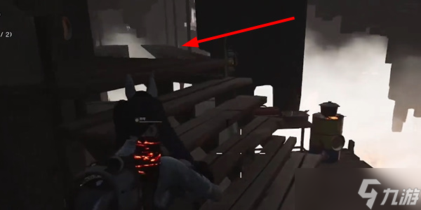 - 上来可以看到地上有个武器箱,然后从旁边的楼梯上去。