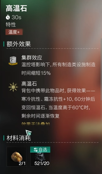 在新赛季中,有一款名为高温石的装备受到了许多玩家的喜爱。这种装备不仅能有效提高你的温度,而且制作起来也非常简便。如果你当前阶段没有合适的保暖物品,不妨多考虑一下制造高温石来为你的角色提供额外的温暖保障。