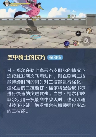 除了组合技之外,甘福尔还具备了名为空中骑士的被动技能。这项技能使得他在骑乘着飞鸟形态的皮耶尔时,可以连续触发两次飞行动作,从而刷新二技能的持续时间,并强化其效果。这样,甘福尔与皮耶尔能够在短时间内快速接近敌人并进行攻击,极大地增强了他们的突进能力。这种攻击方式不仅具有强大的杀伤力,还能有效扰乱敌人的阵型和战术布局。