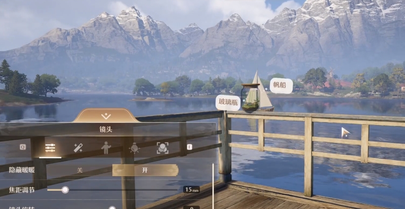 在托卡尼的左侧栏杆位置找到瓶中船的放置点,接着寻找湖中的白色小船,对准直线位置后调节距离与镜头即可。