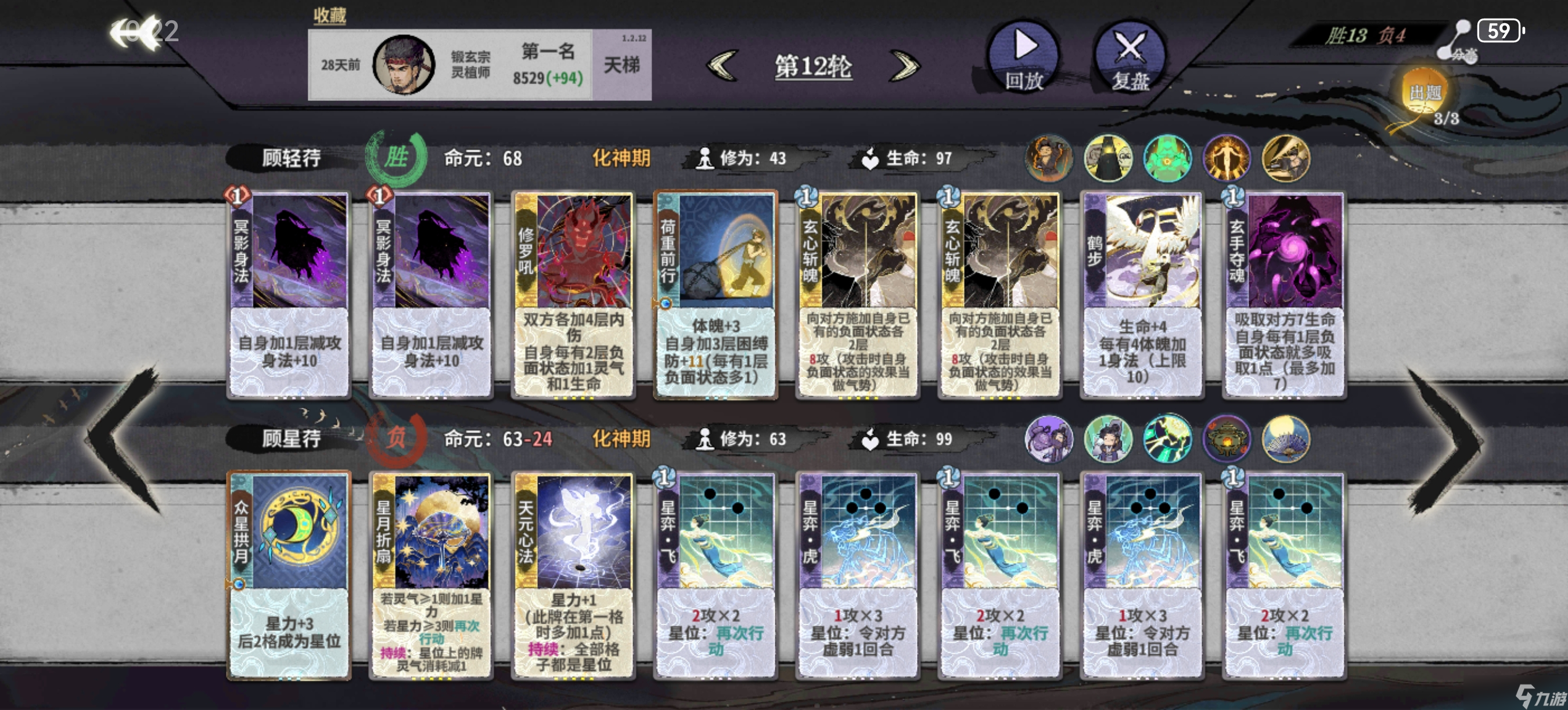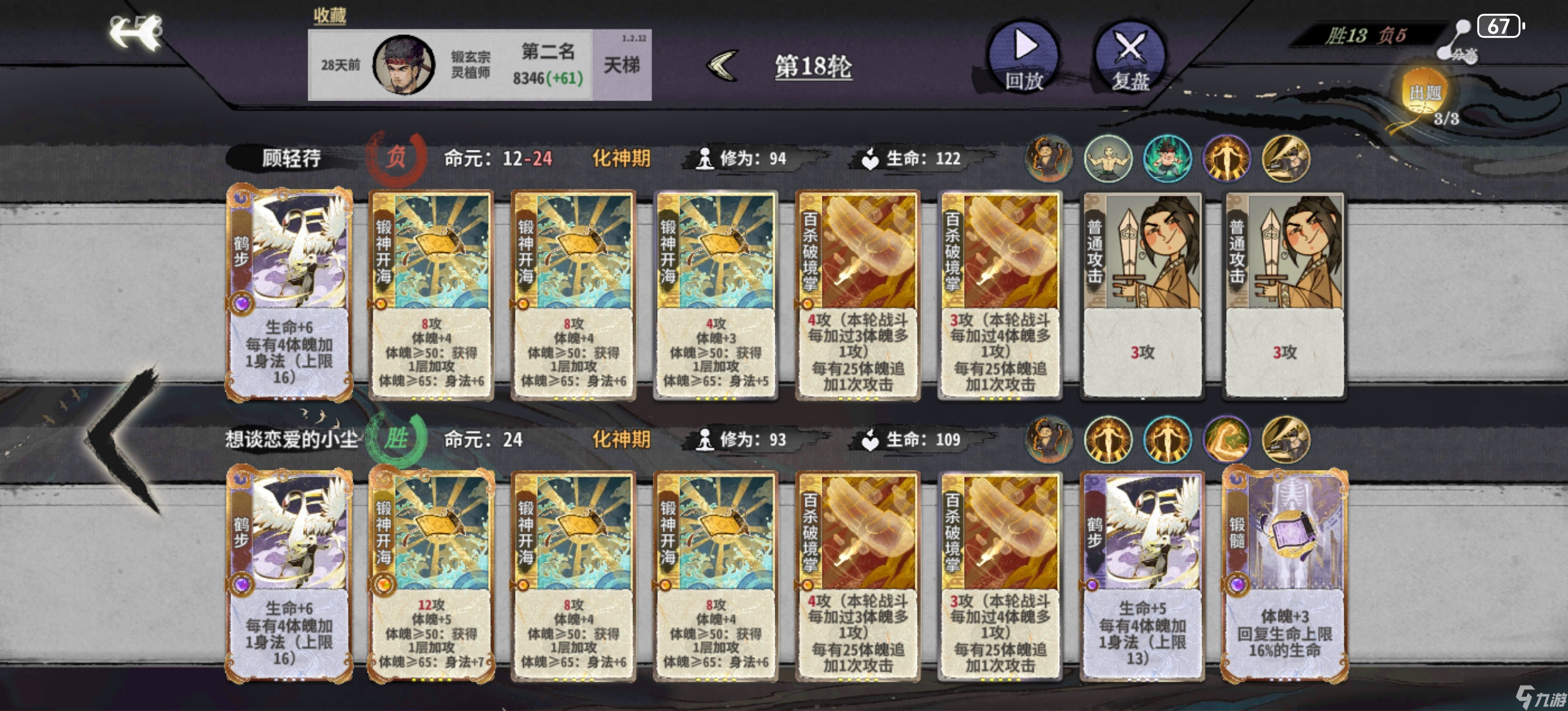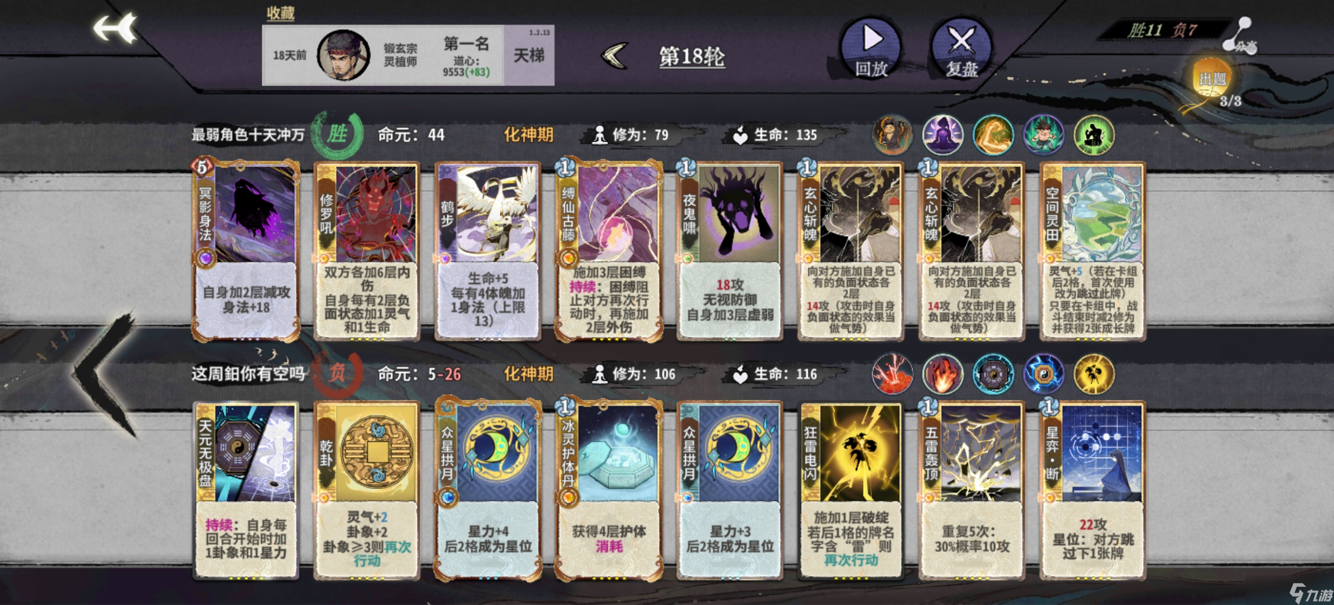 在第十轮或第十二轮升级化神阶段,如果容错率不理想可能会删除紫书,但如果你容错空间充足的话可以保留更多的紫书直到达到紫书满级再考虑删除。在这个阶段中,罗刹扑+双鬼+多段的平铺五动依然能有效击杀对手,因此在更新新牌前通常不会将其他过渡方向作为主要考量。化神初期一般只有来了崩天、迷踪或修罗再加上玄心和冥影才能开始考虑改变过渡手段。体魄方面可以先不操心,在必输的轮次强行提升,但如果你有紫书做基础并赢了的话,那就更理想了。需要特别注意的是,金书配合着迷踪+双鬼、崩天+二级金书或冲霄+一级金书以及二级冥影+二级金书都能凑齐十身法,随时准备好身法计算也很重要。有时候差的身法可能需要用法的冥影来替代法的鹤步,这需要你时刻准备应对各种情况。