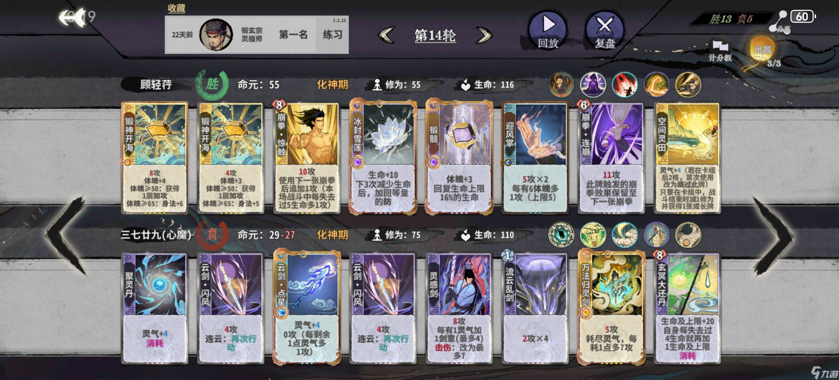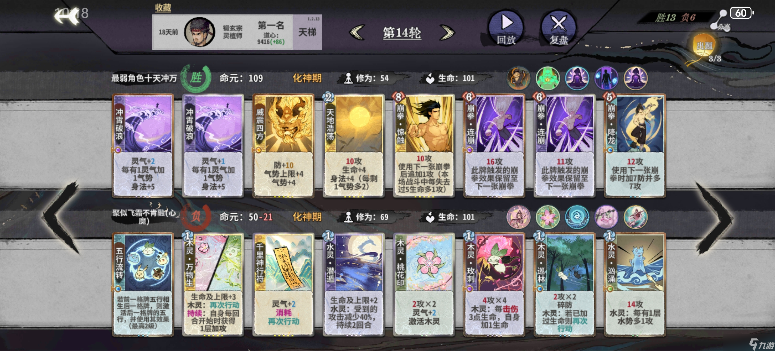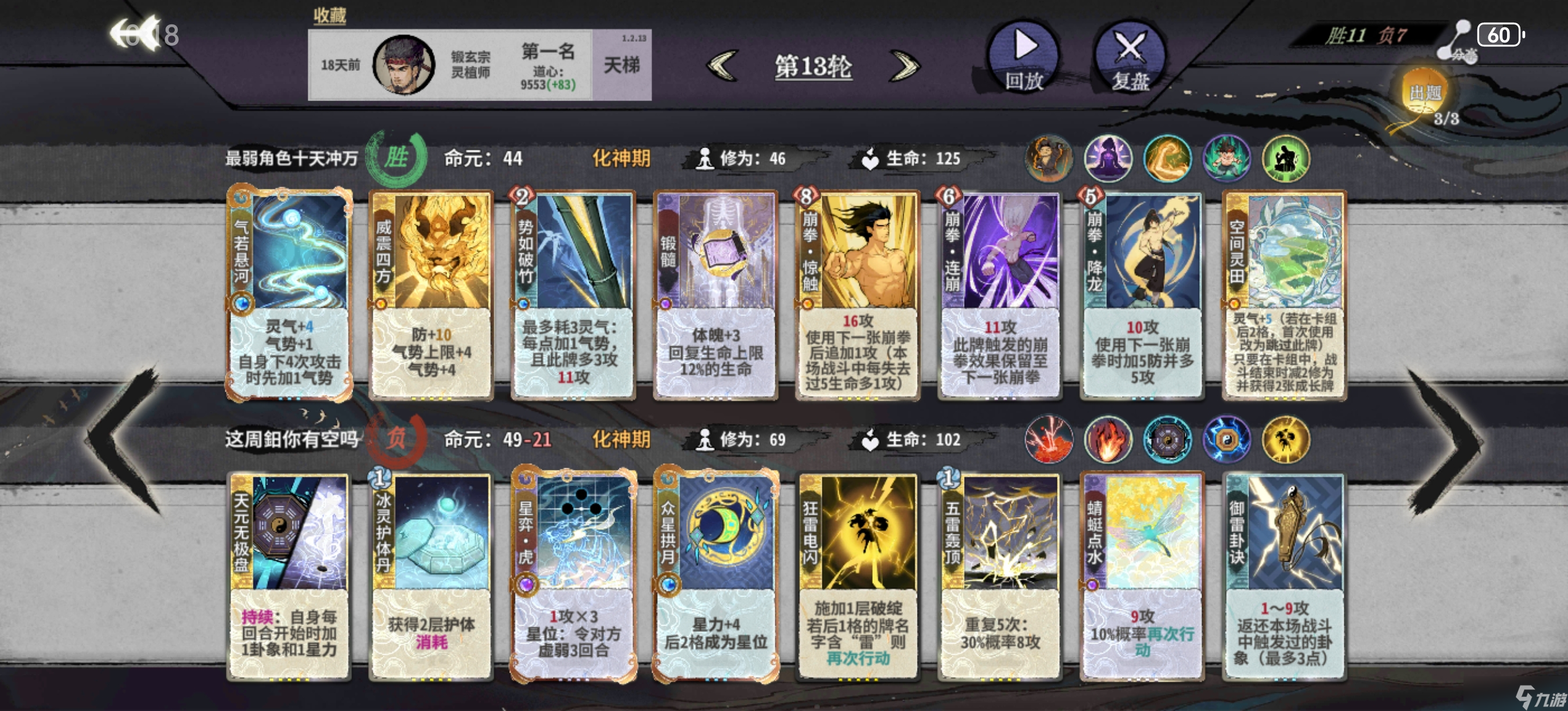 第五轮上金丹,大搜,因为这一打法需要满级的双鬼拍门以及大量的金丹卡(迎风饿虎),且需要激进删体魄,需要都d满或有满级双鬼拍门为止。打无防对手罗刹扑 双鬼拍门 迎风/剑支竹/饿虎四动即可击杀,中间可以插入荷重前行偷体魄,所以迅速删完其他锻体卡是至关重要的(这也是为什么 不能合任何一张锻体卡)。荷重前行同样不合,平铺多张对位并强行拉上体魄,追求又锻又赢。