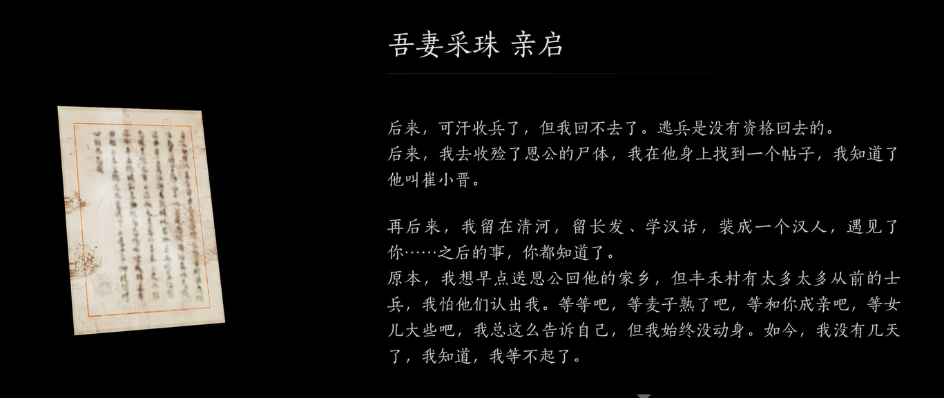 当你终于遇见烈不进后,她的反应超出了你的想象。得知崔小晋的过往后,烈不进决定带你去见他的家人。随后,你和她一同参与了崔小晋的安葬仪式。这段悲伤的告别仪式让你深感震撼,也更加深刻地理解了他的故事。