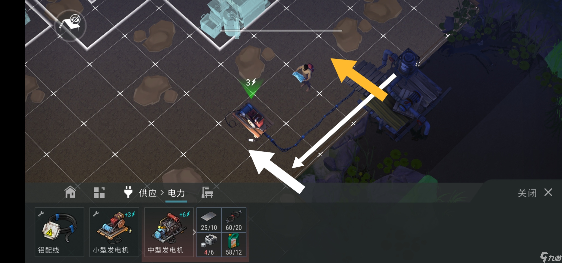 白色箭头表示水管线路的铺设,用于后期水工项目的电力连接;而黄色箭头则指示着供水管路的方向。在建造时,将发电机位置向左移动一步,便可以实现与水路最接近的位置,同时也更加便于日后进行管道系统和水电设施的调整和改造。