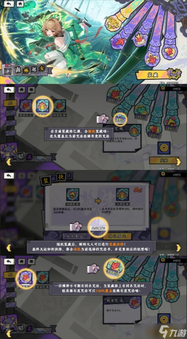 简言之,先用低稀有的紫咒诘打好基础(至于选择哪五个可以参考他人的攻略我未深入研究)。找到对应的适配的高稀有紫咒诘后,就可以完全覆盖了。注意一定要同名的,但按上就不能取了,务必慎重考虑其价值和是否值得使用金色版本。此外,还要优先给输出增加咒诘,因为目前这类资源相对匮乏。