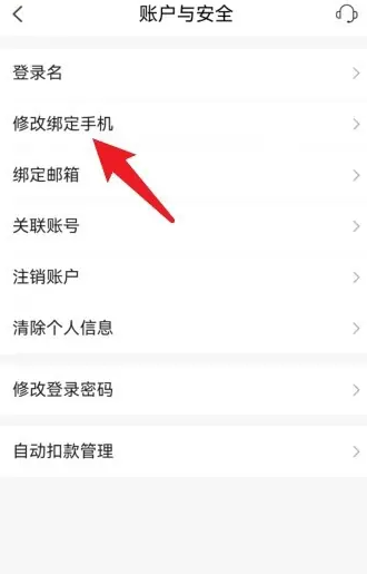 在打开的账户与安全页面中,点击修改绑定手机,把手机号修改为新的手机号码即可