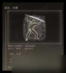 获得突刺战灰后,玩家只需将其装备到武器上即可体验其强大的威力。该战灰拥有快速且高频率的突袭能力,非常适合对付多个敌人或进行连击。在使用时,玩家应仔细观察敌人的动作和节奏,并选择最佳时机发动突袭,以打断敌人的攻击并造成大量伤害。突刺战灰不仅能够提升战斗效率,还能大大增强你的胜率!