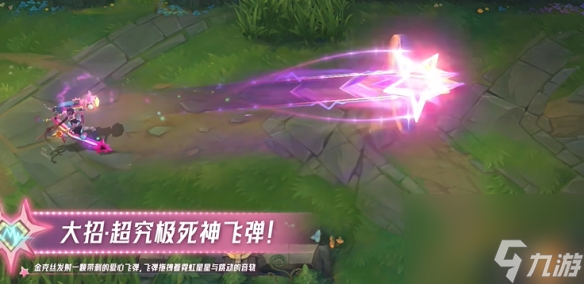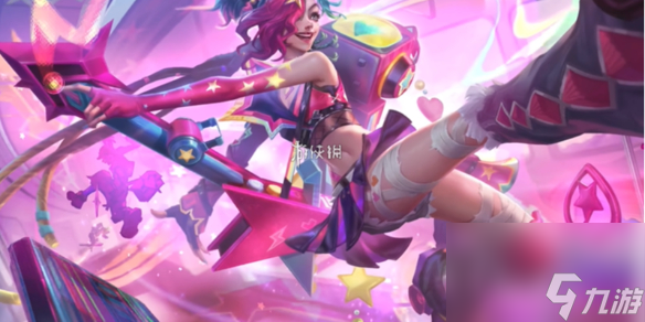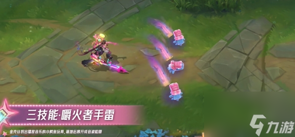 - 大招:金克丝发射一题带刺的爱心飞弹,飞弹掩拽着霓虹星星与跳动的音轨。