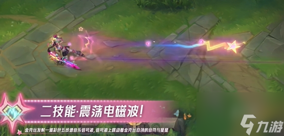 二技能:金克丝释放一道炫彩五线音符光柱,光柱中跳跃着她独特的旋律与星辰。