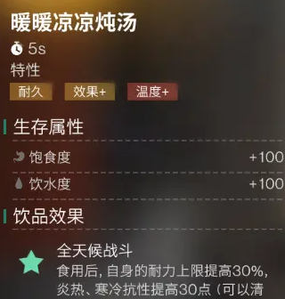 火把和熵素灯不仅能提升角色周围的温度,是探索时期不可或缺的装备。前两个阶段拥有这些设备后,几乎可以抵抗大部分低温了。到了第二阶段,还能解锁暖暖凉凉炖汤这种料理,它可以接触失温和中暑状态,并且显著提高我们的耐力、寒冷和炎热抗性。