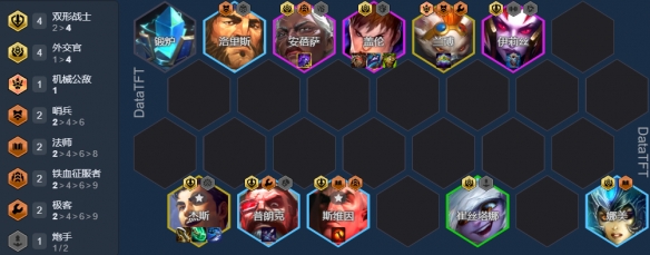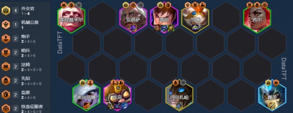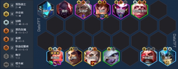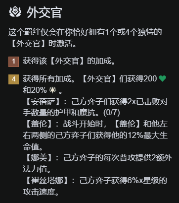 外交体系绝对是最适合追求重质不重量平衡的体系!全体队员都能享受到安倍萨的强大双抗,娜美超凡的回蓝能力、小炮的高攻速以及德玛西亚生物的显著生命加成。再加上外交官额外获得的生命值和伤害增幅,使大家的基础面板都变得非常强劲!海克斯提供的最大生命值进一步巩固了这一优势!