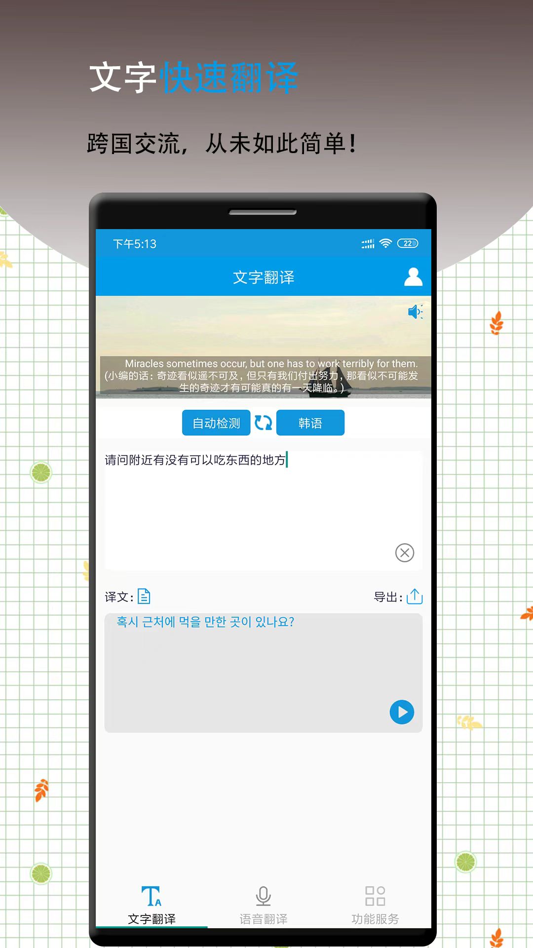 支持了多种语言能够进行文本和语音以及图片翻译等功能,而且大家只要进行拍照扫描,就可以提取文字选择性的去进行翻译。