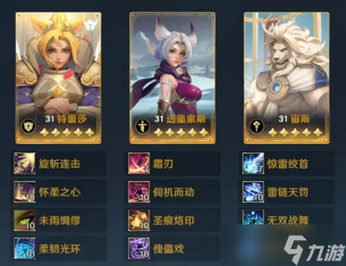 主C选择宙斯,其自带技能雷链天罚可以传导伤害,AOE能力拉满。搭配无双战舞来提升法强,配合魔能牢笼打出禁用效果,与透墨索斯的沉默形成双封。透墨索斯主要依靠反击进行输出,技能方面选择圣痕烙印提高暴击和吸血,傀儡戏提供禁疗效果。特蕾莎携带未雨绸缪和柔韧光环,确保队伍前三回合的生存能力。由于该队伍没有携带队长增益类技能,因此可以选择双抗更高的特蕾莎当队长,确保队伍的生存。