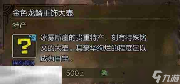 稀有度金色龙鳞重饰大壶,仅在怪物猎人:荒野冰雾断崖的丰饶期出现,是完成特定任务或成就的必备物品。