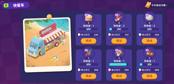 餐车可以通过同一调料刷熟来升级,一次性可以得到原料。在与外卖进行搭配时,只需要提高几个调料的熟练度即可,剩下的调料可以从外卖带来的礼包中选取,这样既节省了时间也增加了性价比。