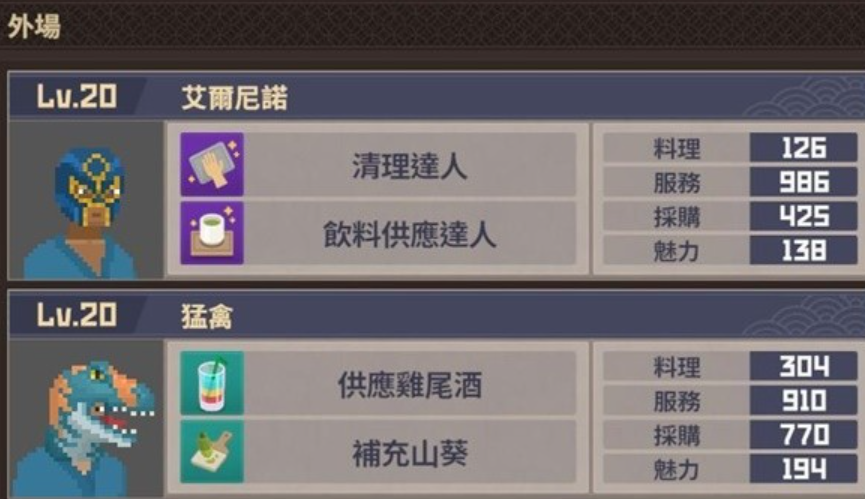大堂方面推荐埃尔尼诺,它快速清理杂乱位置和完美提供饮料服务的技能,可以帮助我们节省大量的时间,除他以外也比较推荐同样是清理达人的比利。派遣方面前期的话谁都可以,除了上面比较重要的员工外,可以把多余角色全都派遣出去,让他们带来更多的获取,后期建议多升级达维娜,她一天能带回来调味料和其他获得,如果发展好开分店要选员工当经理,建议选德瑞,他的数值高,又会擦桌子又可以倒鸡尾酒十分万能。