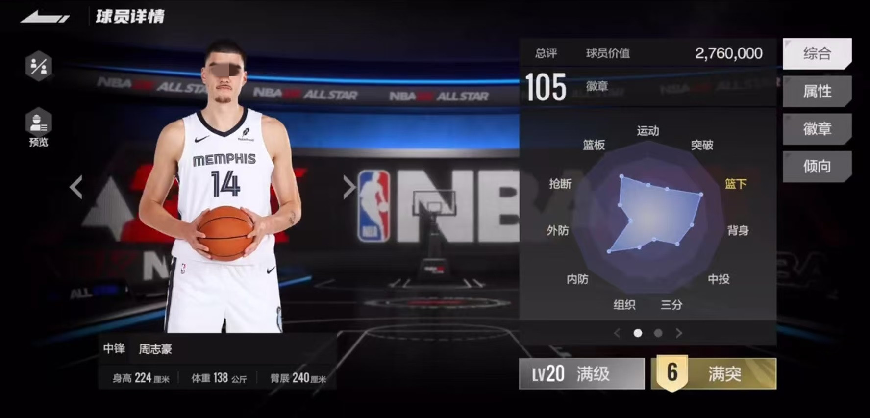需要注意的是周志豪在中投和三分属性方面偏低,三分只有47,中投也只有82,速度方面也仅有57,这也就意味着在实战过程中,想要依靠周志豪来拉开空间,几乎是无法实现的。好在拥有140体力,这样在防守端还可以较长时间跑动。这名角色是属于新秀球员,所以目前暂时没有徽章。在实战中篮下防守能力可圈可点。进攻回合因为速度比较慢的缘故,非常推荐和投射型的队友一起搭配,主要打的就是持球档,还有在篮下吃饼能力也是很不错的。