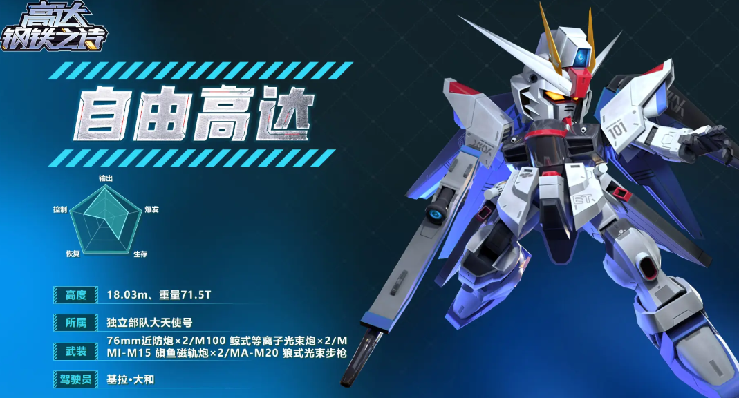 主动群攻型高达,输出大核。主动“全炮门发射”,对随机两个敌方目标造成攻击伤害。成功击坠可恢复能量,异常最多触发两次。精英解锁额外对燃烧敌人伤害,显著提升。