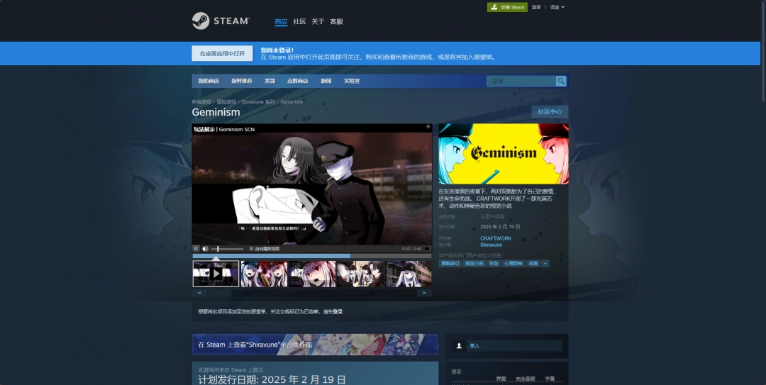 Geminism是由CRAFTWORK工作室制作并由Shiravune公司发行的一款视觉小说游戏。该游戏官方网站是一个普通的网页,同时,Steam平台上购买游戏的页面也属于其官方渠道。在进入游戏购买界面后,可以获取到游戏的所有相关信息。
