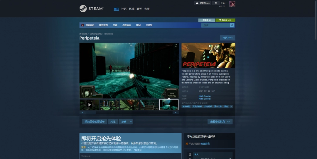 Steam平台需要先安装Steam平台,之后注册一个账号登录,然后搜索“Peripeteia”进入商店购买页面。