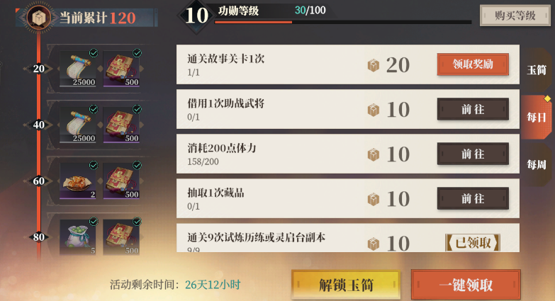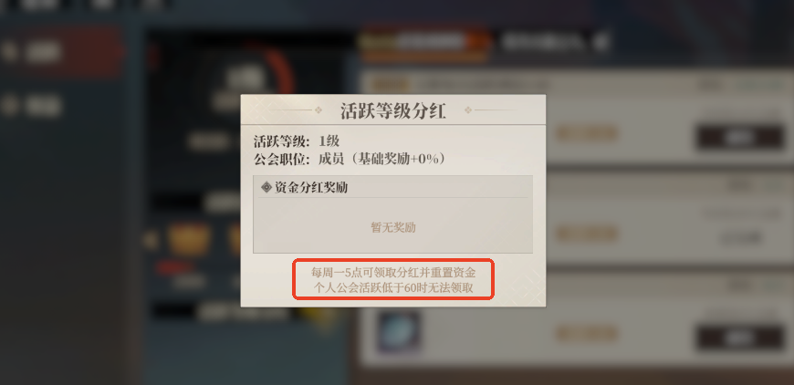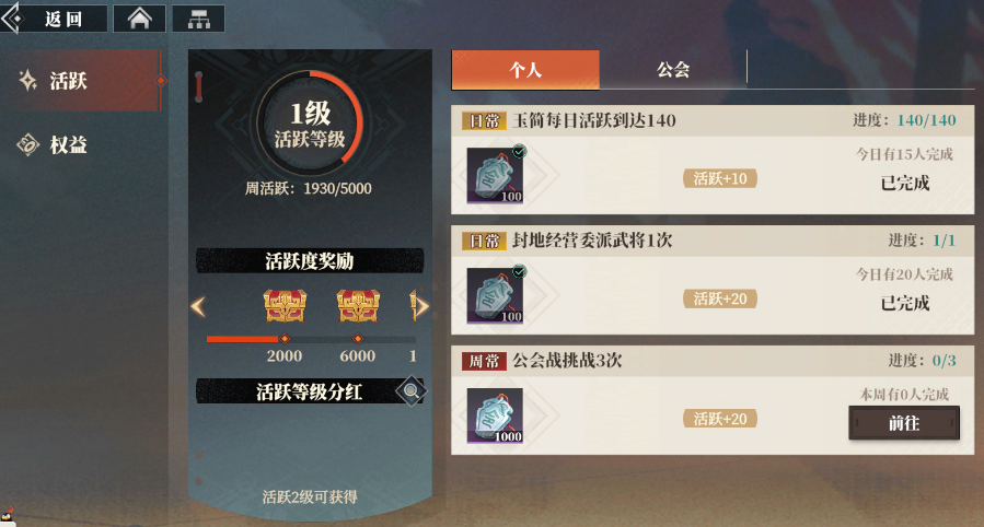 游戏中的重置任务主要包括每日玉简任务和公会活跃度两项,其中每日累计功勋值达到是保底条件,以确保有三山壁。同时,完成玉简日常、参与封地经营以及每天参与公会挑战可以获取公会分红,该分红也会在凌晨刷新。