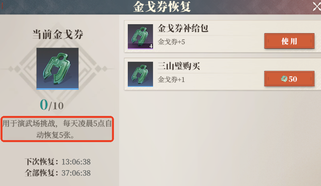 在竞技场上,与对手决斗需消耗“金戈券”。每日清晨五点,该券会自动补满五张,总量限制为十张,强烈建议大家每天参与,争取击败对手,即使未能获胜也应将券耗尽。