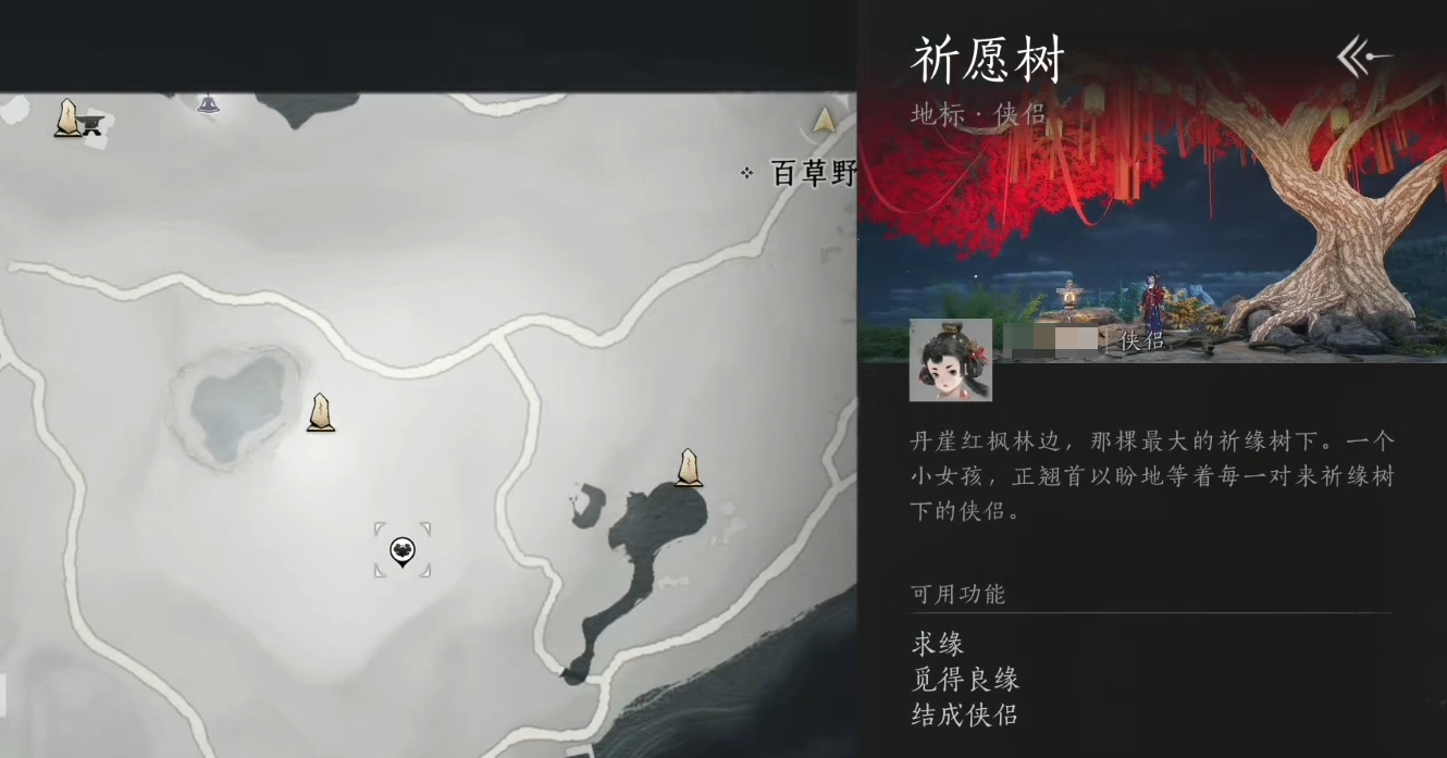 在菜单界面可以发现“侠侣”系统。开启后能了解到个人当前的侠侣状态,“觅佳期”代表单身,玩家需前往“祈愿树”,通过在红叶上写下“心绪”的方式来发起“寻缘”,主动发起寻缘的玩家可参与“暮缘”。