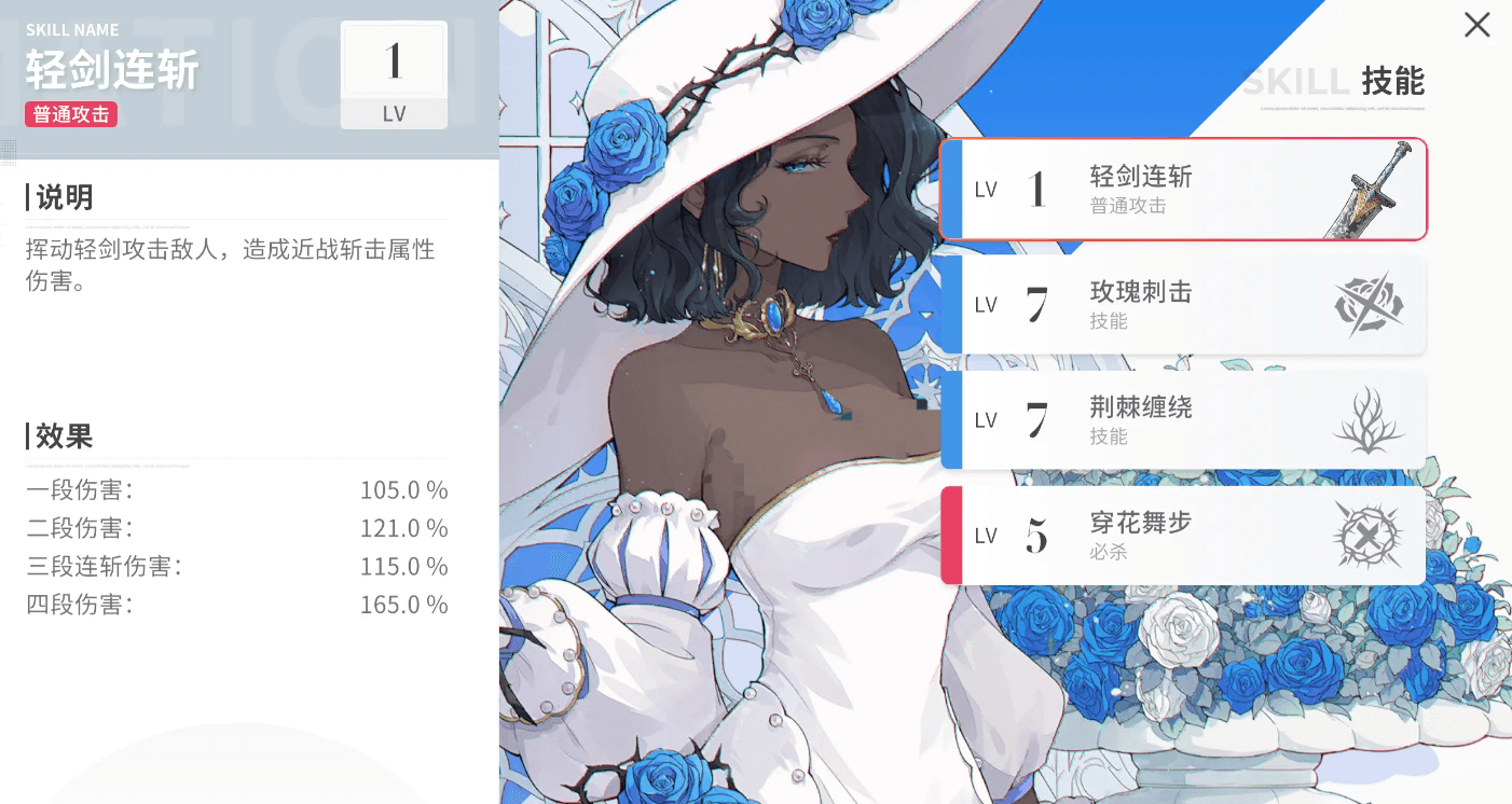 芙使用双手剑作为武器,总共有普攻,最后一段伤害最高。由于是双手剑的关系,普攻的前后摇都比较长,因此掌握好时机释放非常重要。她的“玫瑰刺击”会在目标的位置生成巨大的蓝色玫瑰,并突刺斩碎,对玫瑰周围的敌人形成近战斩击伤害。如果剑刃触及目标,玫瑰破碎时还会向四周额外释放尖刺造成二次伤害。