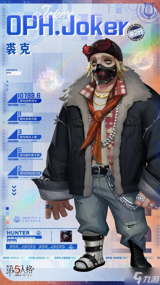 小丑-OPH.JOKER一身街头打扮,金属元素、红黑面罩、随意系着的橙色小丑领巾,无一不在彰显个人魅力。数据表示,他的演绎得分非常优异,极高的击倒次数和淘汰人数,在对局中所向披靡,庄园就是他的制霸场!