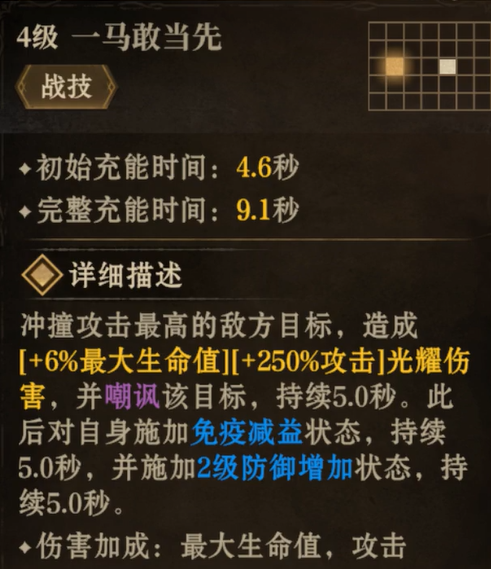 至于萨高米尔的主动技能,“一马敢当先”则是一招强势的冲锋技能。他会冲向敌方最强的目标,造成基于最大生命值和攻击力的光耀伤害,并且给敌人施加嘲讽效果。这不仅让敌人专注攻击萨高米尔,还能保护后排队友免受伤害。而在技能结束后,他还能自己获得免疫减益效果,几乎是无视敌方的负面状态,堪称战场上的“铁人”。