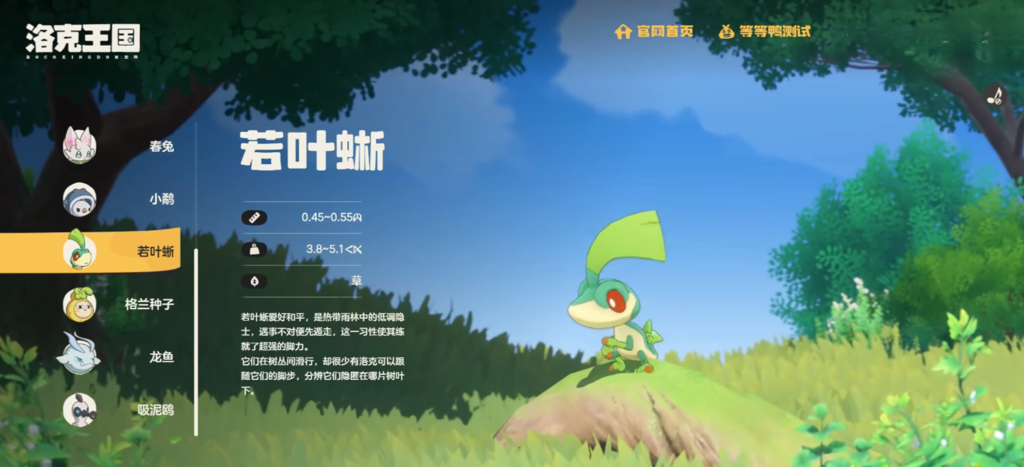 不知道玩家们有没有获得游戏二测的资格,游戏的二测马上就要开启了。在二测内容中玩家们又将能捕获很多可爱且有趣的精灵,这样的话精灵业态也会更加多样,让小伙伴们都在期待二测的开启。洛克王国世界若叶蜥怎么样,在游戏的热带雨林地图上生活着一些非常精致小巧的蜥蜴,它们有个很显著的特点就是头顶上有一片叶子,所以取名为若叶蜥。