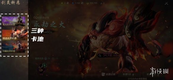 - 特选剑灵祈愿为专属剑灵up池,60抽保底必得炎煌,必定不会歪!