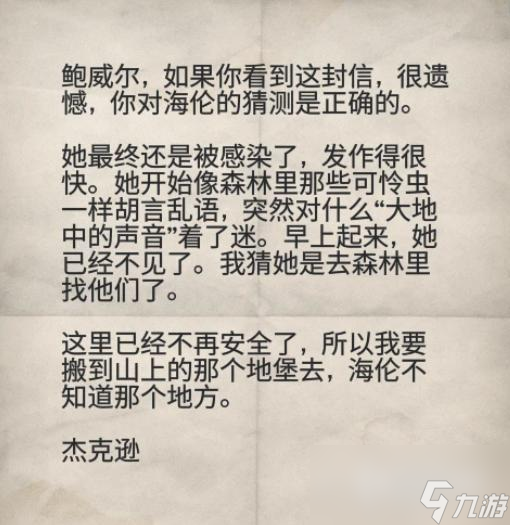 和他交谈后,他提醒我们在这个没有文明的世界,要小心的选择信任的人;他还偷听到那些穿防化服的人谈论要封锁隔离这里,而且还提到一个“中转站”的秘密项目。