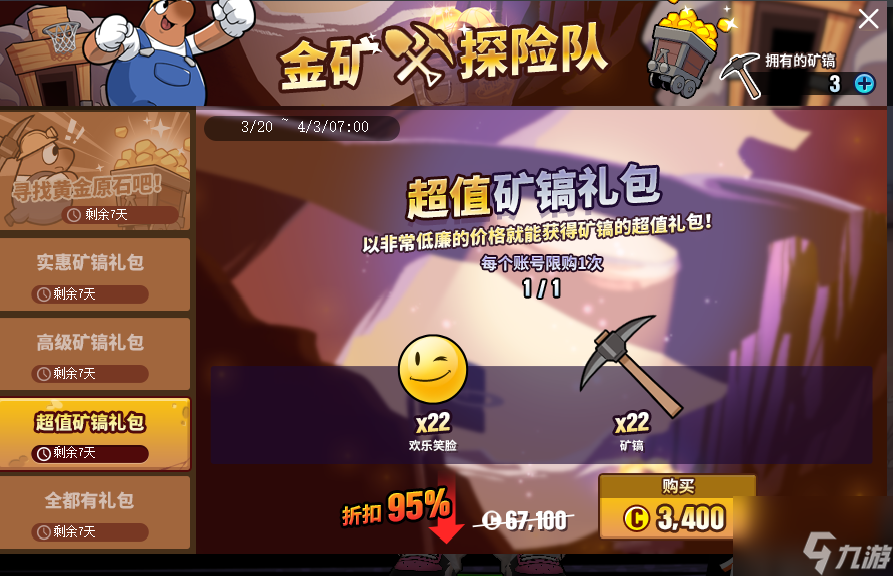 金矿探险队即将结束,活动可享受超值矿镐礼包。只需购买,就将有机会获得笑脸及矿镐,抓住这个机会吧!每个账号限购一次。