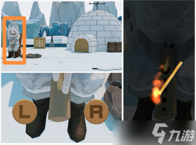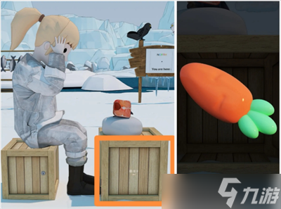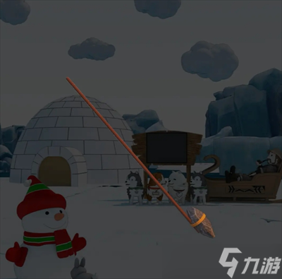 点击雪橇上的人物,用火柴点燃其烟斗并观察烟圈大小;右侧木箱打开后可得胡萝卜。