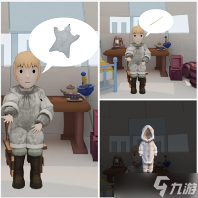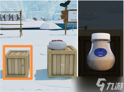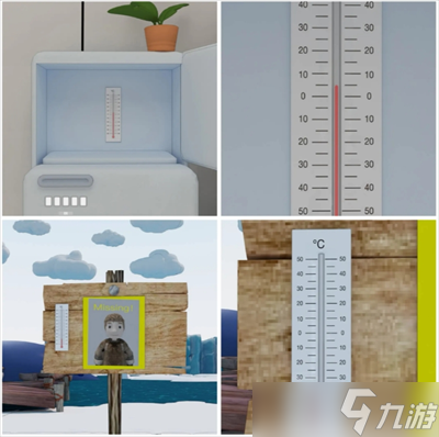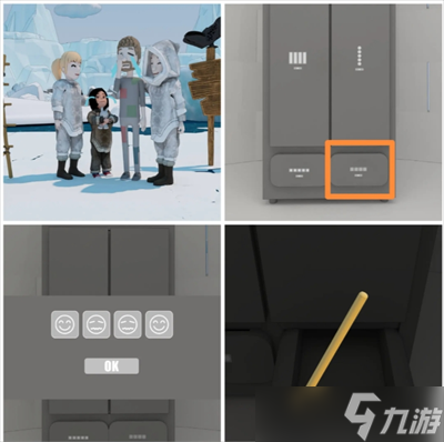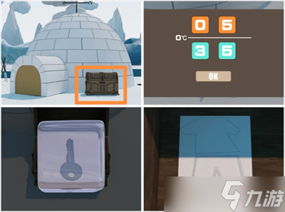 9. 查看木板上的温度,以及冰箱上层的温度,可以打开雪堡右边的箱子,拿到一把被冻住的钥匙,和看到一张衣服的图片(后面会用到)。