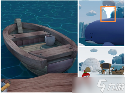 - 给船用船桨,把饲料倒入鲸鱼上方,可以发现雪人后方多了一个雪堡。
