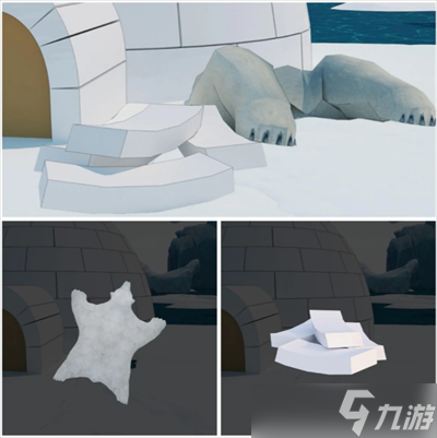 - 在新出现的雪堡旁边捡到砖块和熊皮。