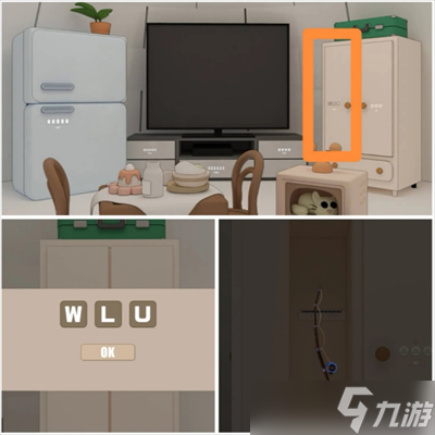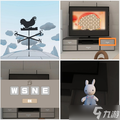 17. 查看雪堡上方,停在鸡头方向的字母,用来打开电视下方右边的柜子,拿到一个兔子玩偶。