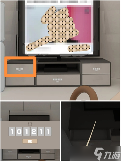 结合衣柜左侧图片和雪堡右侧箱子服饰,获得数,用于打开电视左上抽屉,取出针。