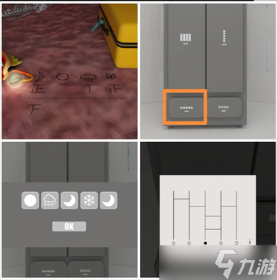 25. 查看黄色箱子旁边的线索,根据“正”的笔画,从1 - 5,打开灰色柜子的左下,拿到一张图片。